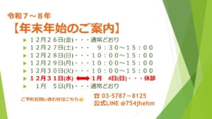 12月26日(金)通常通り 12月27日(土) 9:30~15:00 12月28日(日)10:00~15:00 12月29日(月)10:00~15:00 12月30日(火)10:00~15:00 12月31日(水)~ 1月4日(日) 休診 1月 5日(月)通常通り